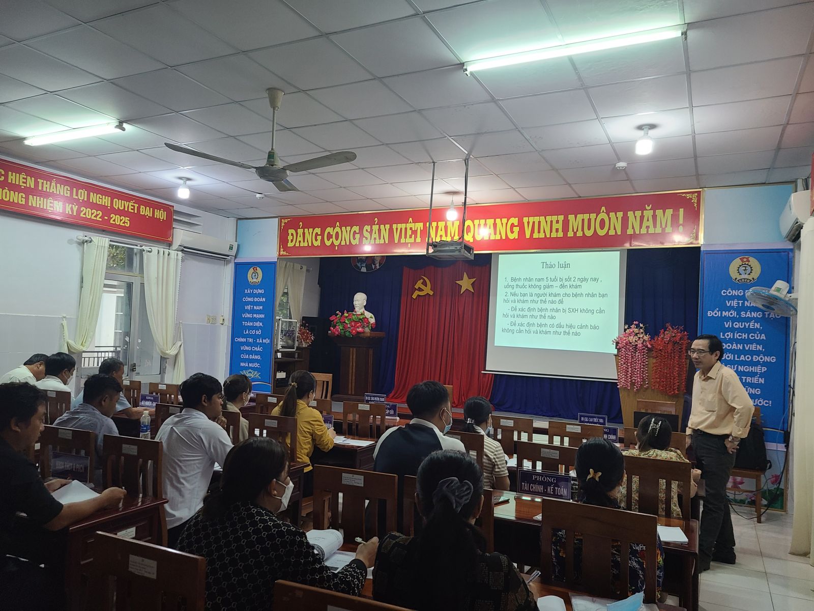 Ngày 31/5/2023, Trung tâm y tế huyện Hòa Bình tổ chức tập huấn chẩn đoán, điều trị sốt xuất huyết Dengue ở trẻ em. Dự lớp tập huấn có: Bác sĩ Tăng Phương Thanh - Giám đốc Trung tâm y tế; cán bộ y tế công tác tại xã/thị trấn, huyện Hòa Bình. Tổng số có hơn 20 người tham dự.
